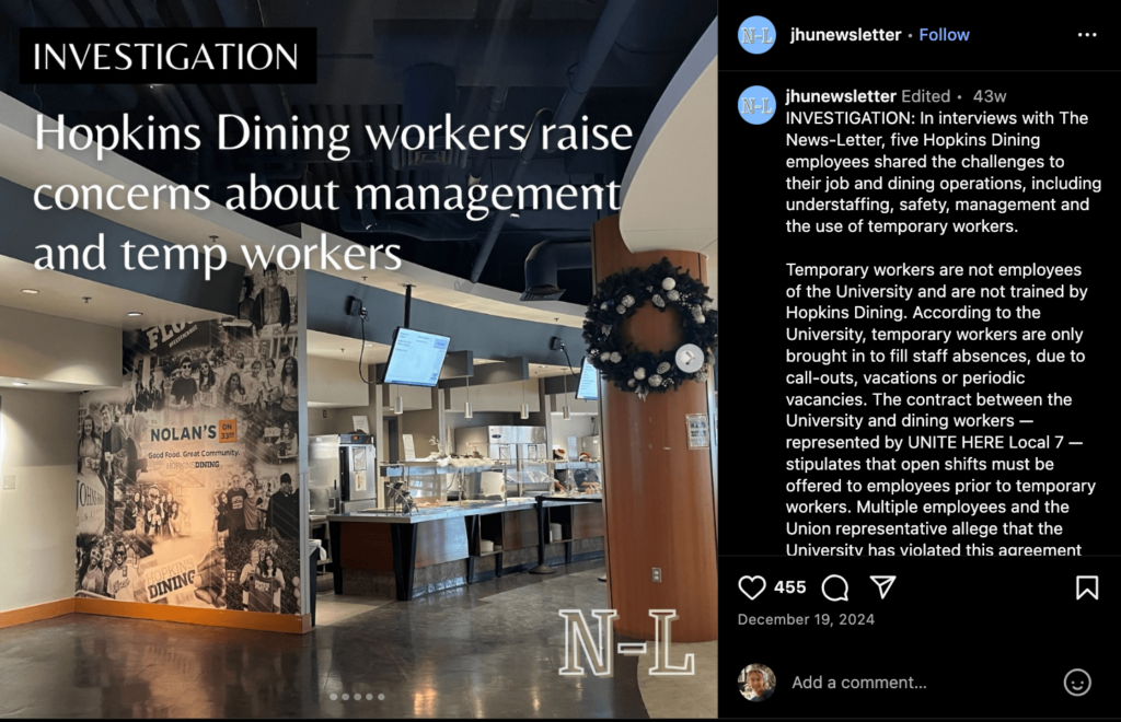 Hopkins Dining Workers Raise Concern About Management and Temp Workers