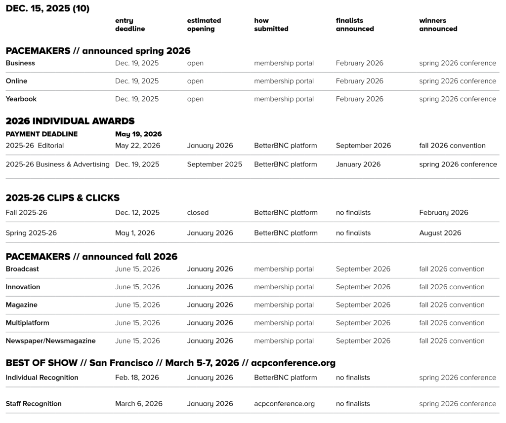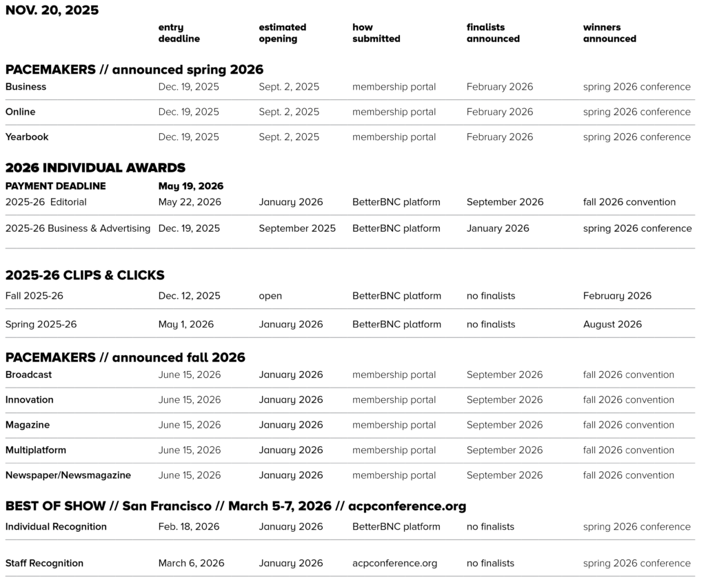 Finalists will be announced in September 2026. Winners will be announced at the Fall National College Media Convention, Nov. 4-7, 2026, Kansas City, Missouri.