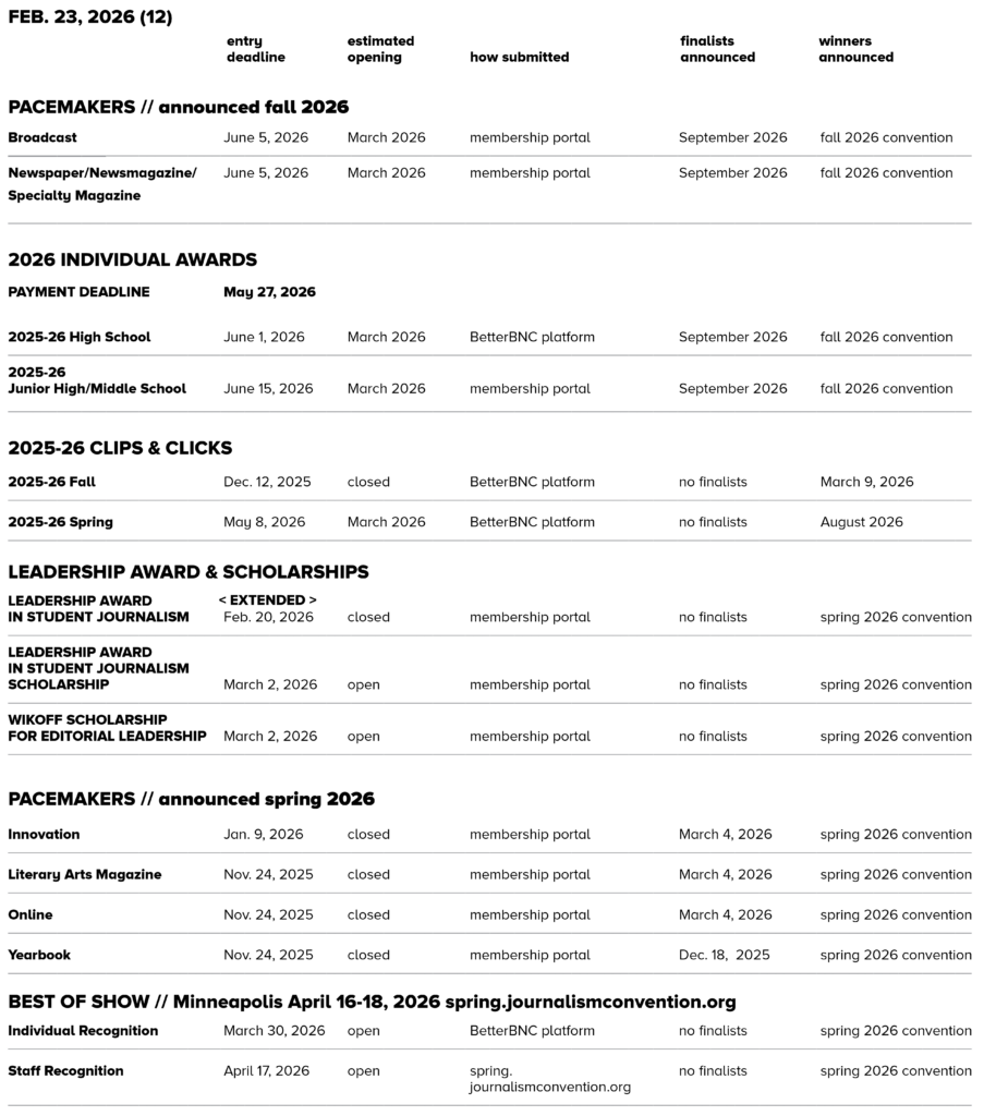 Finalists will be announced in February 2026. Winners will be announced at the JEA/NSPA National High School Journalism Convention, April 16-18, 2026, Minneapolis.