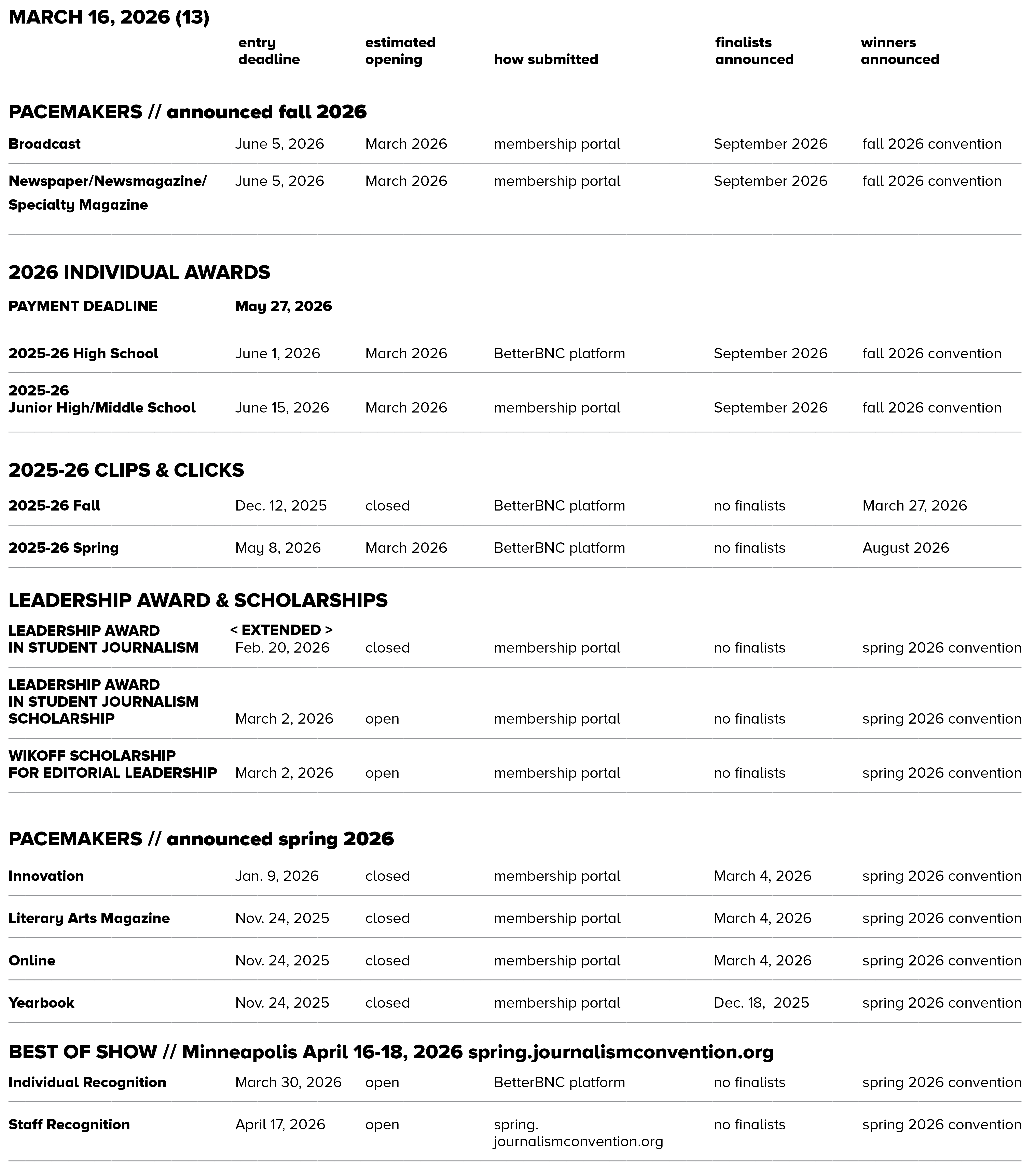 Winners are announced at JEA/NSPA National High School Journalism Convention, both fall and spring. NSPA membership qualifies a publication for participation in the Pacemaker competition. Entries must have been published or broadcast during the dates specified on each entry form. High school and junior high/middle school student media are both eligible and compete in separate categories.